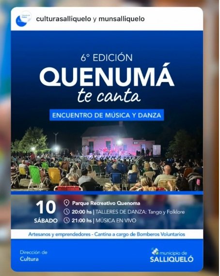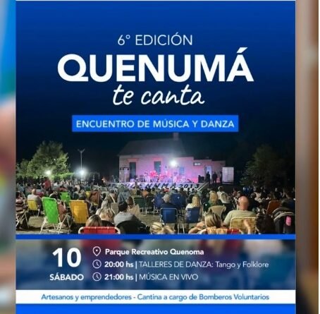 Este sábado se vivirá una nueva edición del evento “Quenumá te canta”, que dará comienzo a las 21 hs, con una destacada grilla de artistas locales y de la zona.