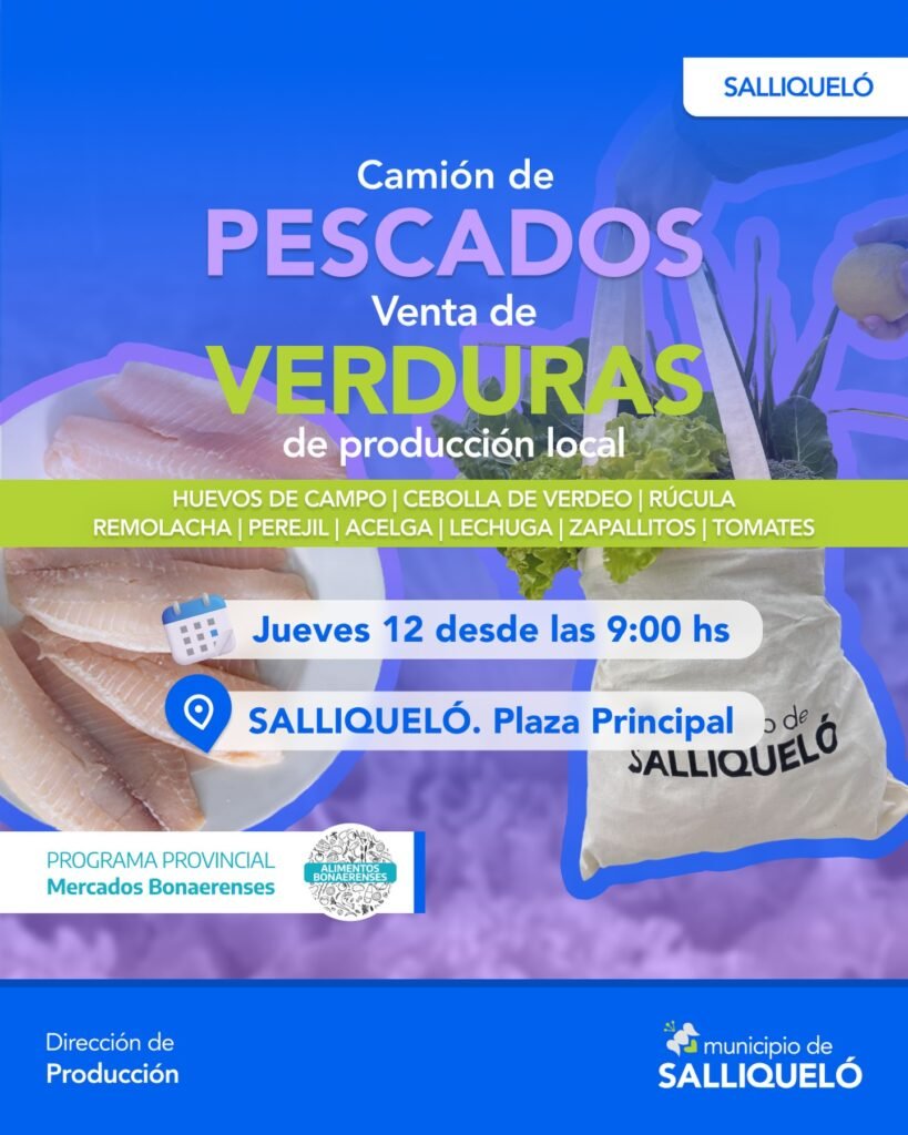 Mañana desde las 9:00 hs, llega a Salliqueló el camión de pescados junto a la venta de verduras de producción local de todas las semanas 🛒
