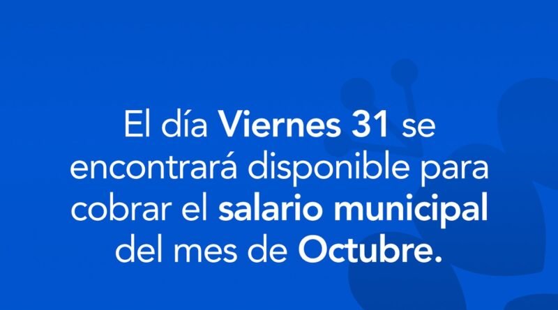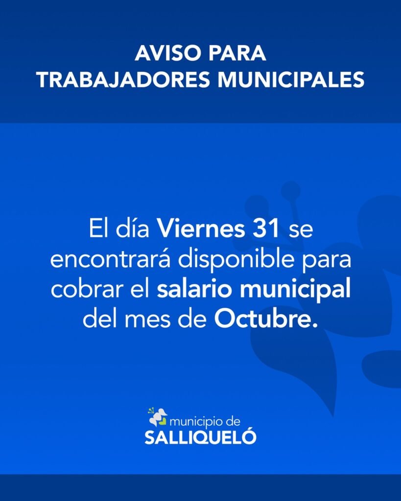 Salliqueló 💬 Aviso para trabajadores municipales: 30 de octubre de 2025 admin El viernes 31 estará disponible el pago de los salarios municipales correspondientes al mes de octubre.