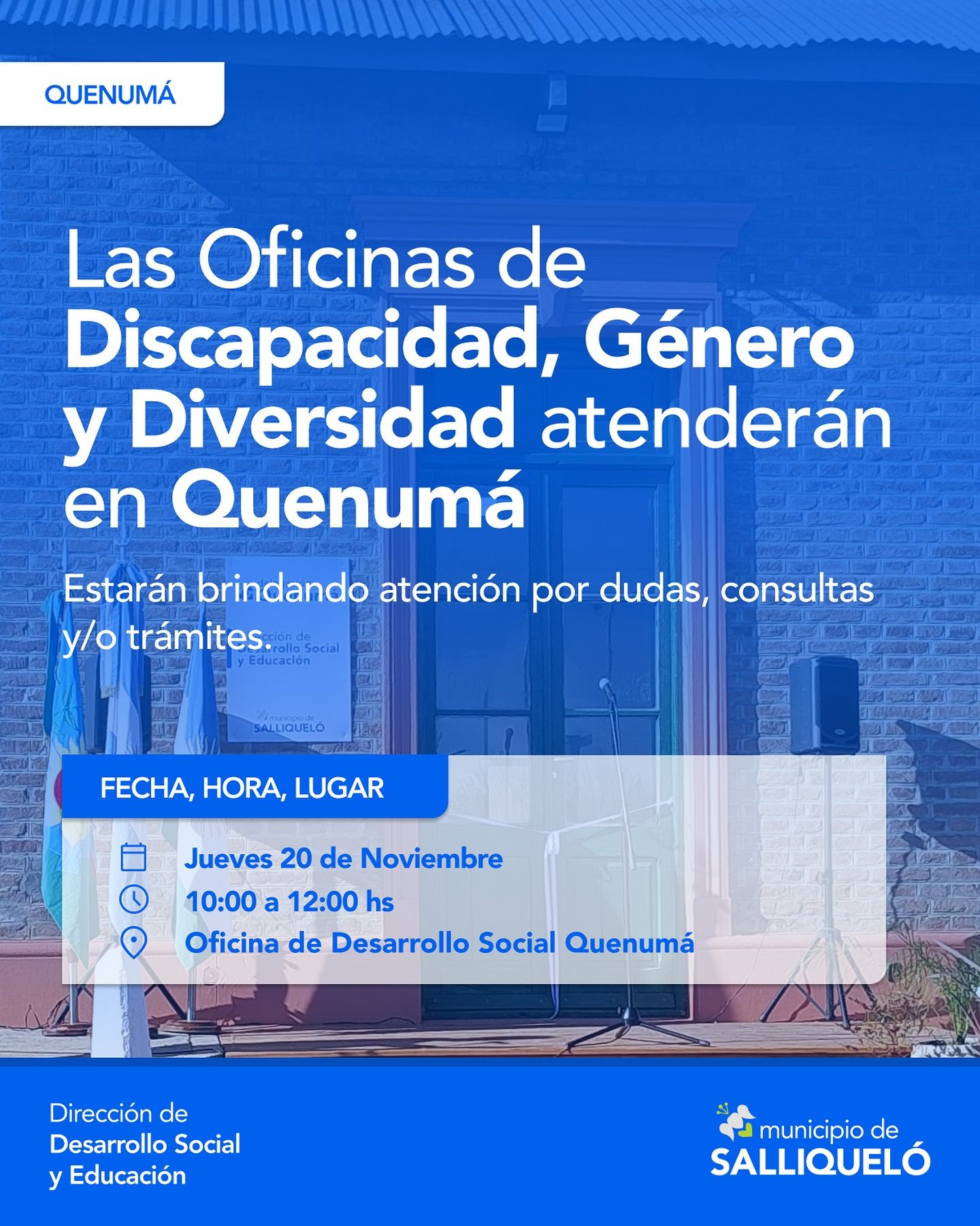 Las Oficinas de Discapacidad, Género y Diversidad estarán brindando atención este jueves 20 de noviembre, de 10:00 a 12:00 hs, en la Oficina de Desarrollo Social de Quenumá.