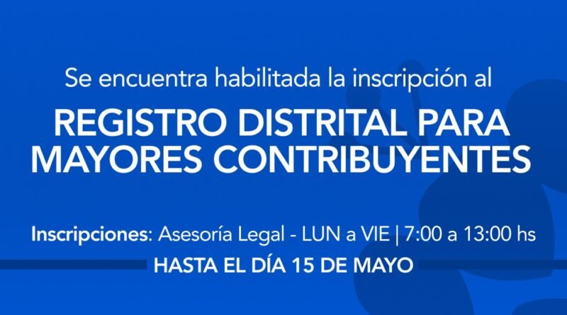 ¡Atención a todos los residentes del distrito! Desde el Municipio anunciamos la apertura de inscripciones para el Registro Distrital de Mayores Contribuyentes, en cumplimiento con el Decreto Municipal N°313/25. Tienen tiempo para inscribirse hasta el 15 de mayo.