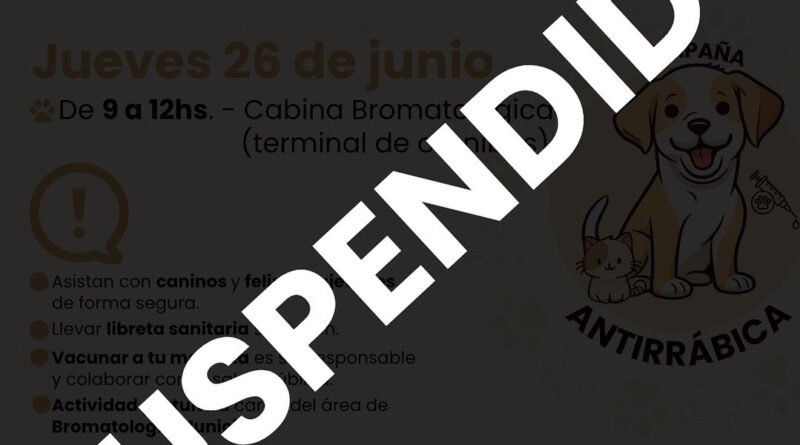 Informamos que la jornada de vacunación antirrábica prevista en la localidad de Garré ha sido suspendida hasta nuevo aviso, por razones de fuerza mayor.