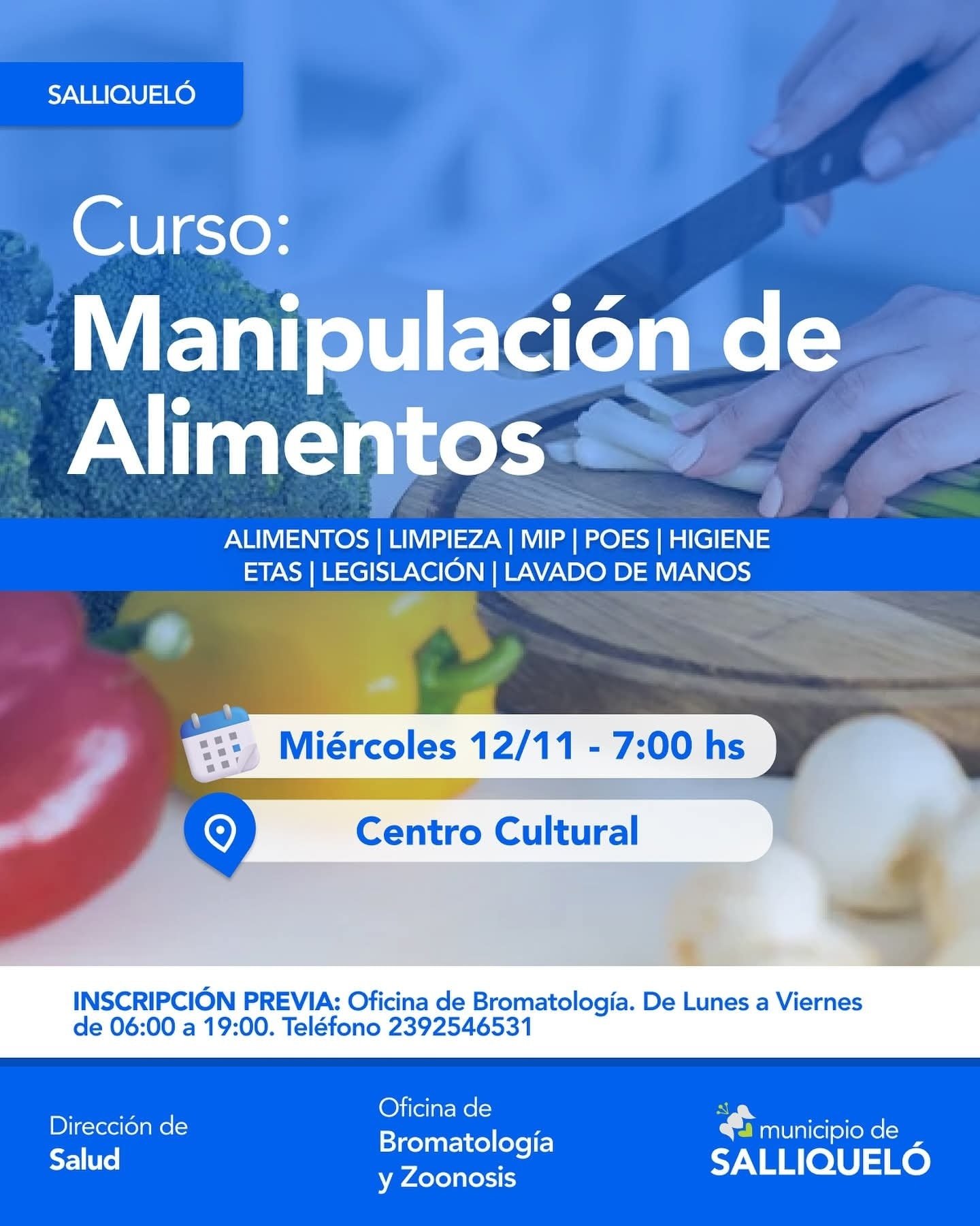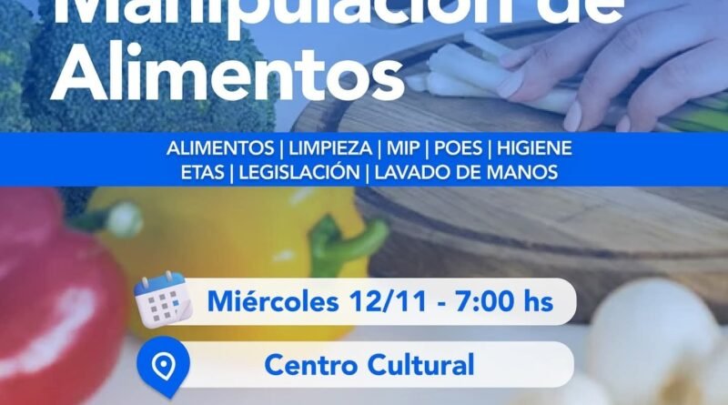 🗓️ El miércoles 12 de Noviembre a las 7:00hs te esperamos en el Centro Cultural para participar de esta capacitación fundamental sobre higiene, seguridad alimentaria y normativa vigente.