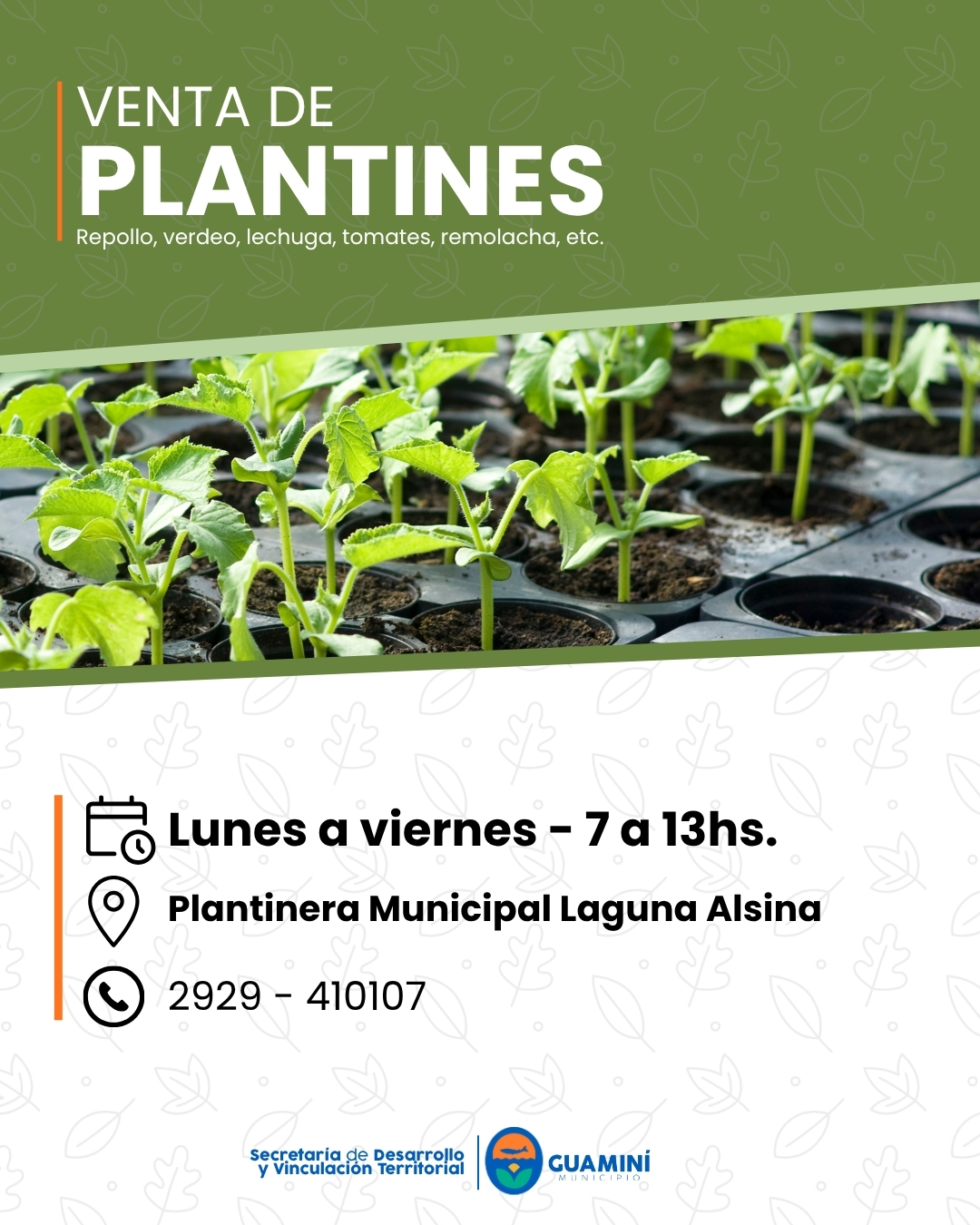 Te recordamos que ya estรกn listos en la Plantinera Municipal de Laguna Alsina los plantines de verduras, hortalizas y aromรกticas para esta temporada primavera-verano. ๐ŸŒธโ˜€๏ธ.