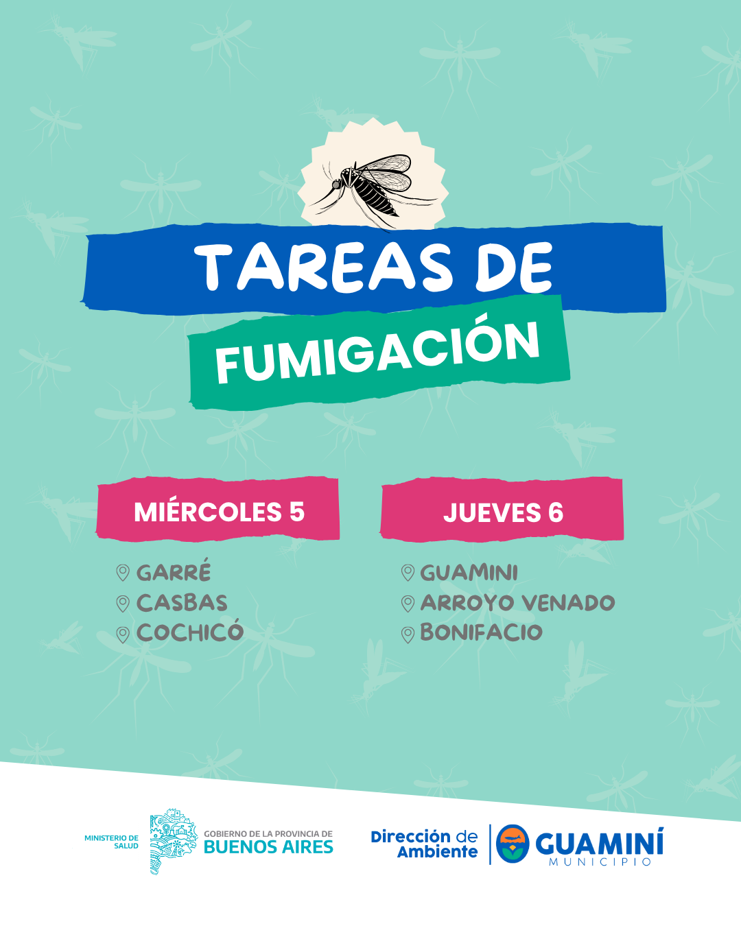 Con el objetivo de prevenir la proliferación de mosquitos y cuidar la salud de nuestras vecinas y vecinos, la Dirección de Ambiente junto al Ministerio de Salud de la Provincia de Buenos Aires realizará tareas de fumigación en las siguientes localidades: