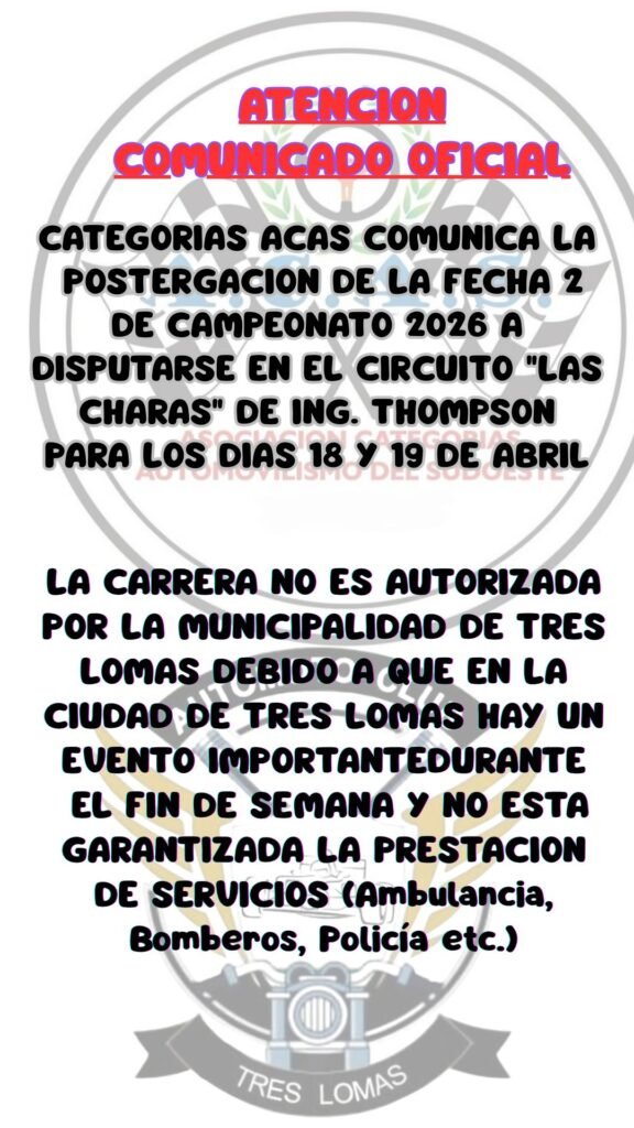 CATEGORÍAS ACAS COMUNICA LA POSTERGACIÓN DE LA FECHA 2 DE CAMPEONATO 2026 A DISPUTARSE EN EL CIRCUITO «LAS CHARAS» DE ING. THOMPSON PARA LOS DÍAS 18 Y 19 DE ABRIL