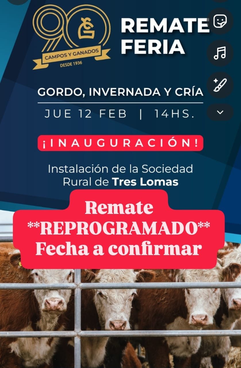 Desde la firma Campos y Ganados S.A se informa la REPROGRAMACION de fecha del Remate Feria inauguración en Tres Lomas anunciado para el jueves 12 de febrero.