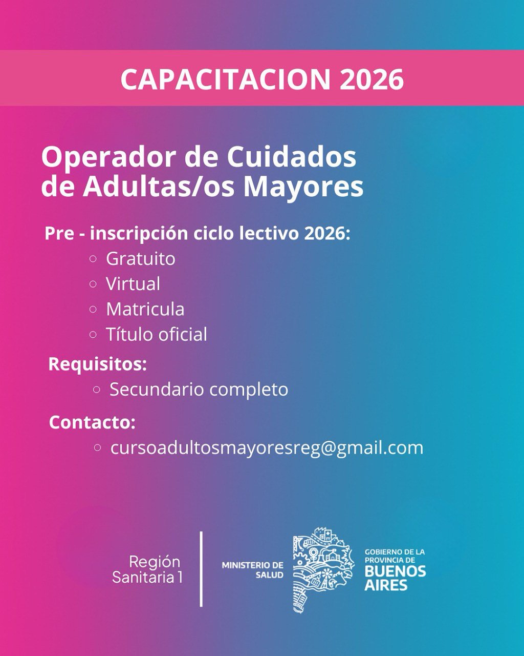 Consultas y pre–inscripción: cursoadultosmayoresreg1@gmail.com