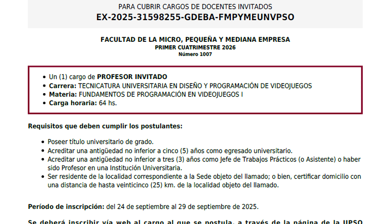 Leer másLa FACULTAD DE LA MICRO, PEQUEÑA Y MEDIANA EMPRESA informa que se encuentra abierta la inscripción para cubrir cargos de