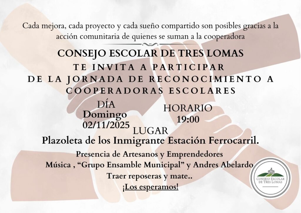 Tres Lomas Consejo Escolar INVITACIÓN JORNADA DE RECONOCIMIENTO A COOPERADORAS ESCOLARES 29 de octubre de 2025 admin