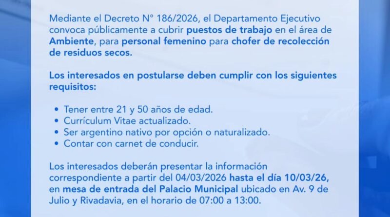 Mediante el Decreto N° 186/2026, el Departamento Ejecutivo convoca a cubrir un puesto de trabajo en la Dirección de Ambiente, destinado a chofer para la recolección de residuos secos, dirigido a personal femenino.