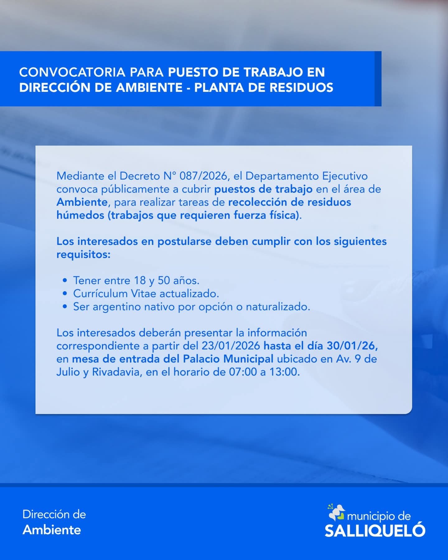 Convocatoria para cubrir puesto de trabajo en la Dirección de Ambiente – Planta de Residuos, para tareas de recolección de residuos húmedos