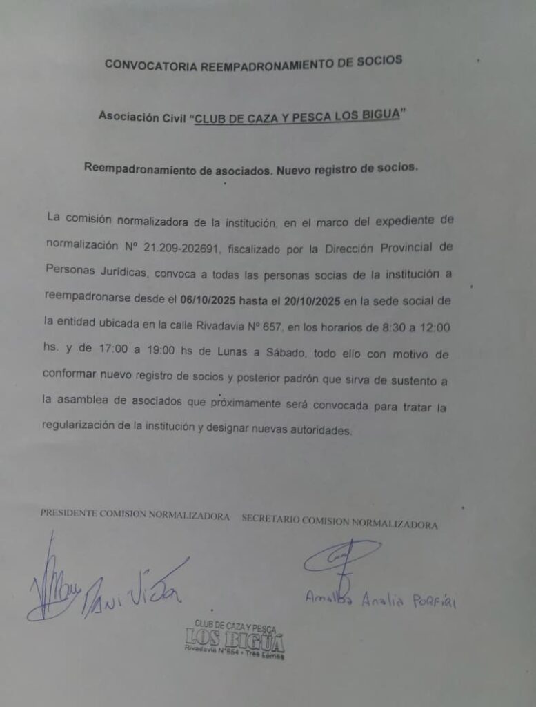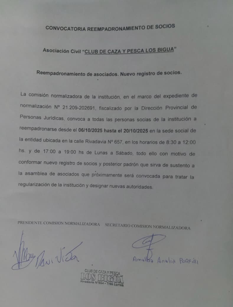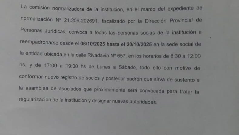 La comisión normalizadora de la institución, en el marco del expediente de normalización N° 21.209-202691, fiscalizado por la Dirección Provincial de Personas Jurídicas, convoca a todas las personas socias de la institución a reempadronarse desde el 06/10/2025 hasta el 20/10/2025 en la sede social de la entidad ubicada en la calle Rivadavia N° 657, en los horarios de 8:30 a 12 hs y de 17 a 19 hs de lunes a sábado, todo ello con motivo de conformar nuevo registro de socios y posterior padrón que sirva de sustento a la asamblea de asociados que próximamente será convocada para tratar la regularización de la institución y designar nuevas autoridades.