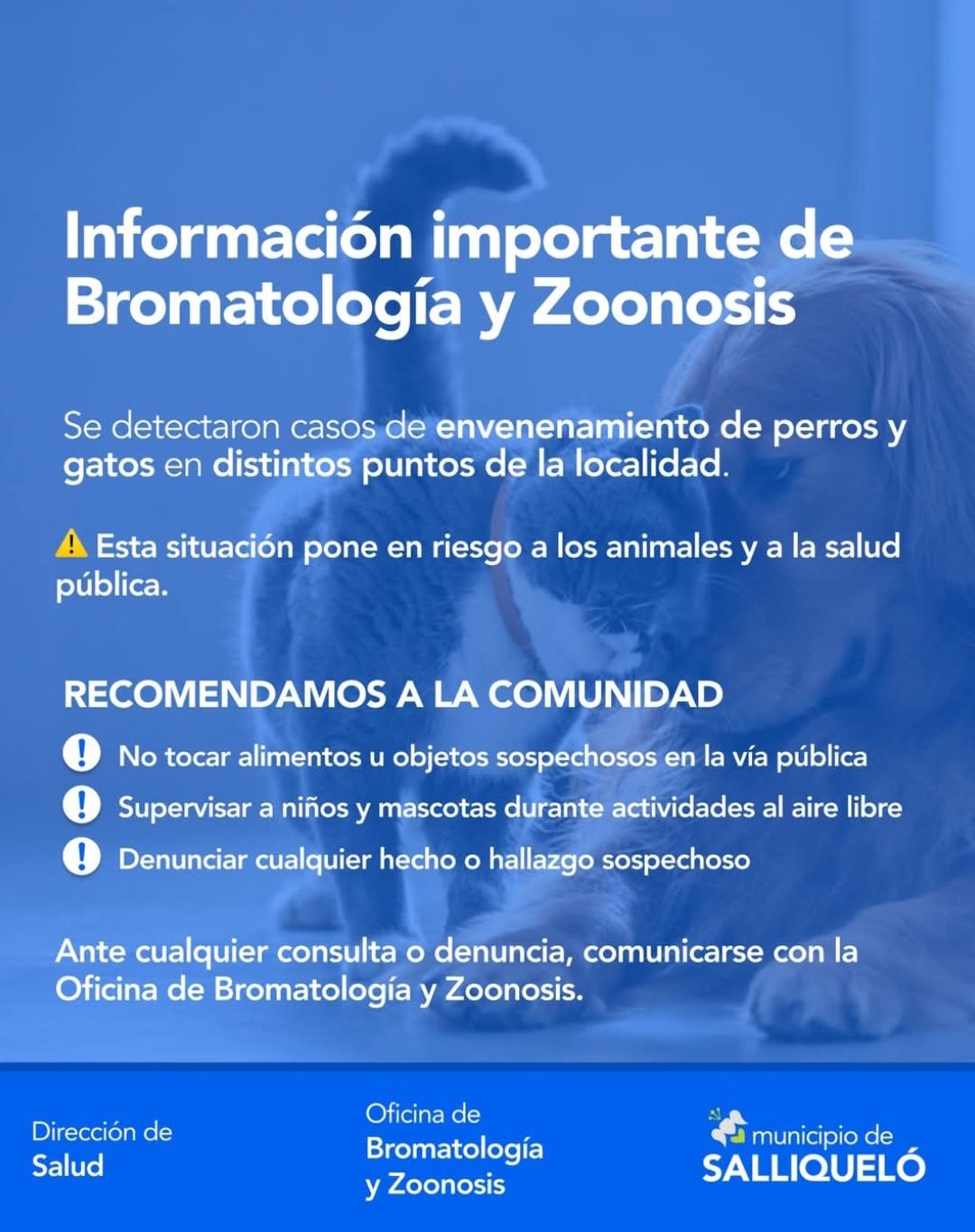 Desde la Oficina de Bromatología y Zoonosis, dependiente de la Dirección de Salud, se informa a la comunidad que durante el transcurso de las últimas semanas se han detectado casos de envenenamiento de perros y gatos, así como animales que presentan síntomas compatibles con envenenamiento, en distintos puntos de la localidad.