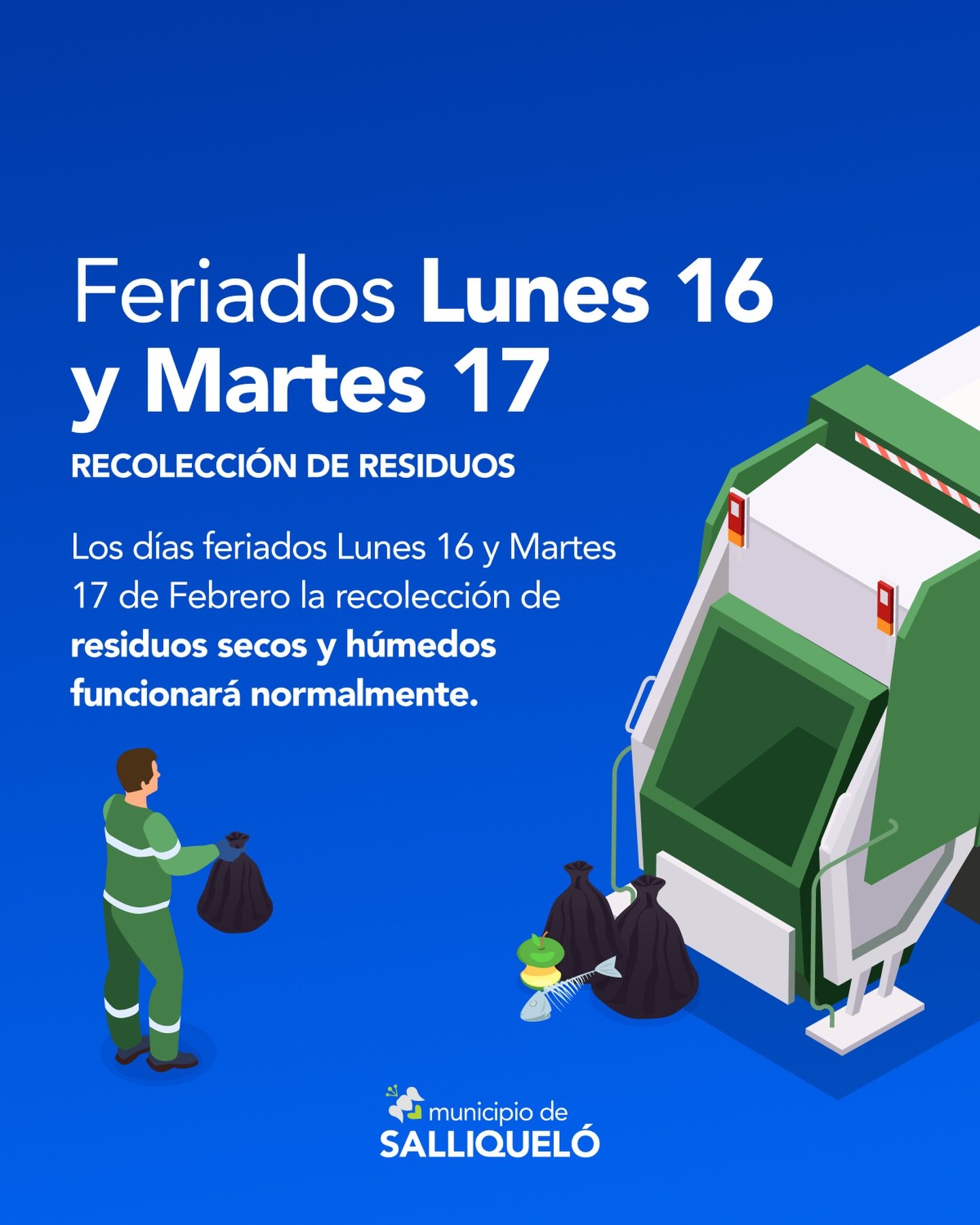 Durante los feriados del lunes 16 y martes 17 de febrero, la recolección de residuos secos y húmedos se realizará con normalidad.