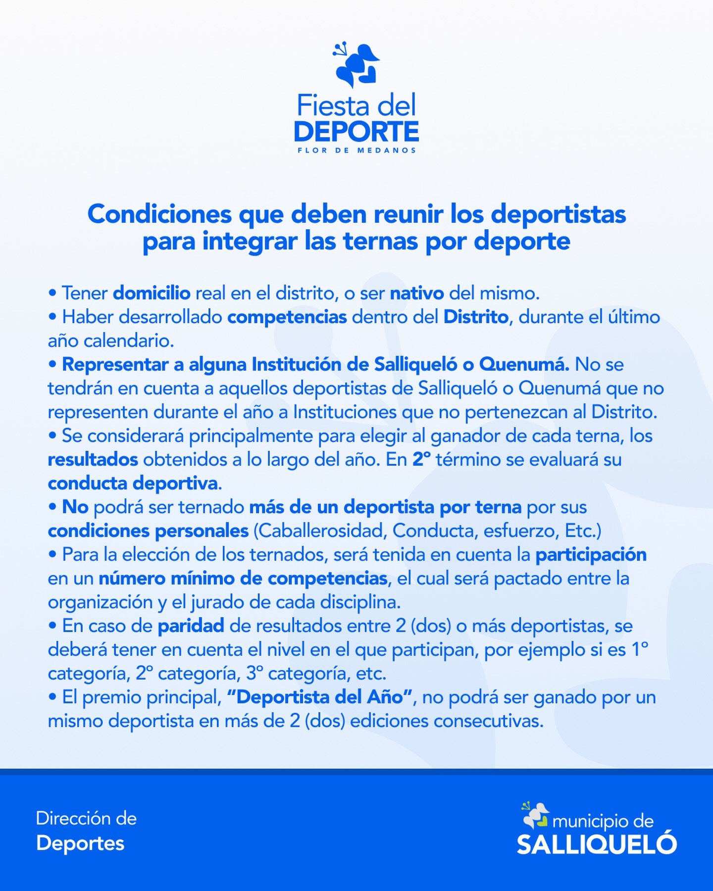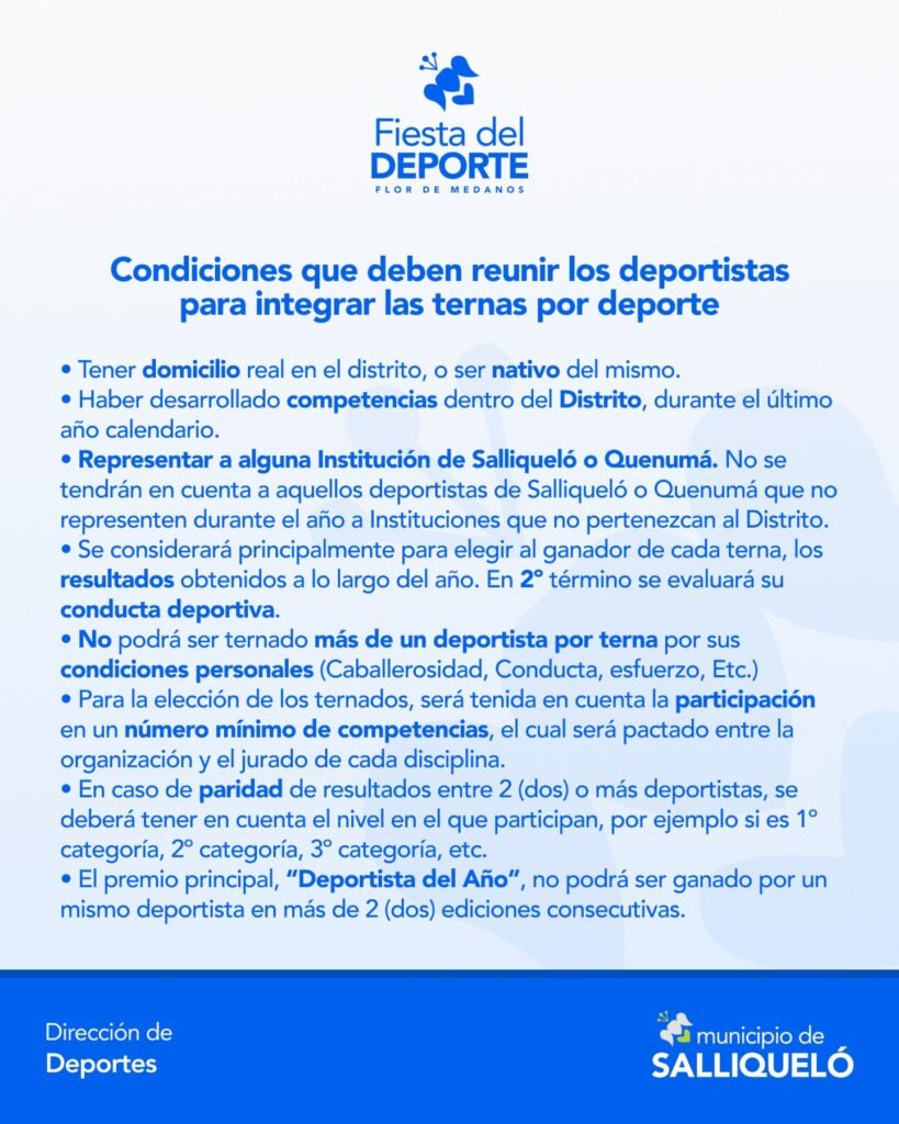 • Representar a alguna Institución de Salliqueló o Quenumá. No se tendrán en cuenta a aquellos deportistas de Salliqueló o Quenumá que no representen durante el año a Instituciones que no pertenezcan al Distrito.