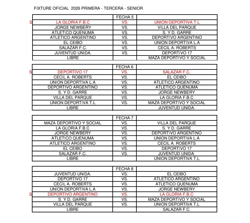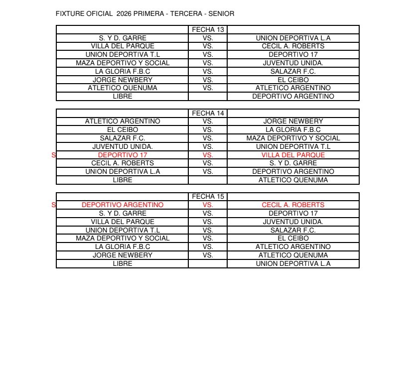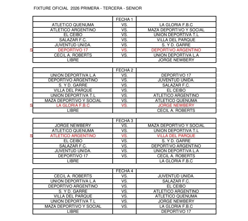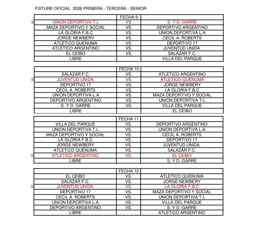 FIXTURE OFICIAL 2026 PRIMERA – TERCERA – SENIOR