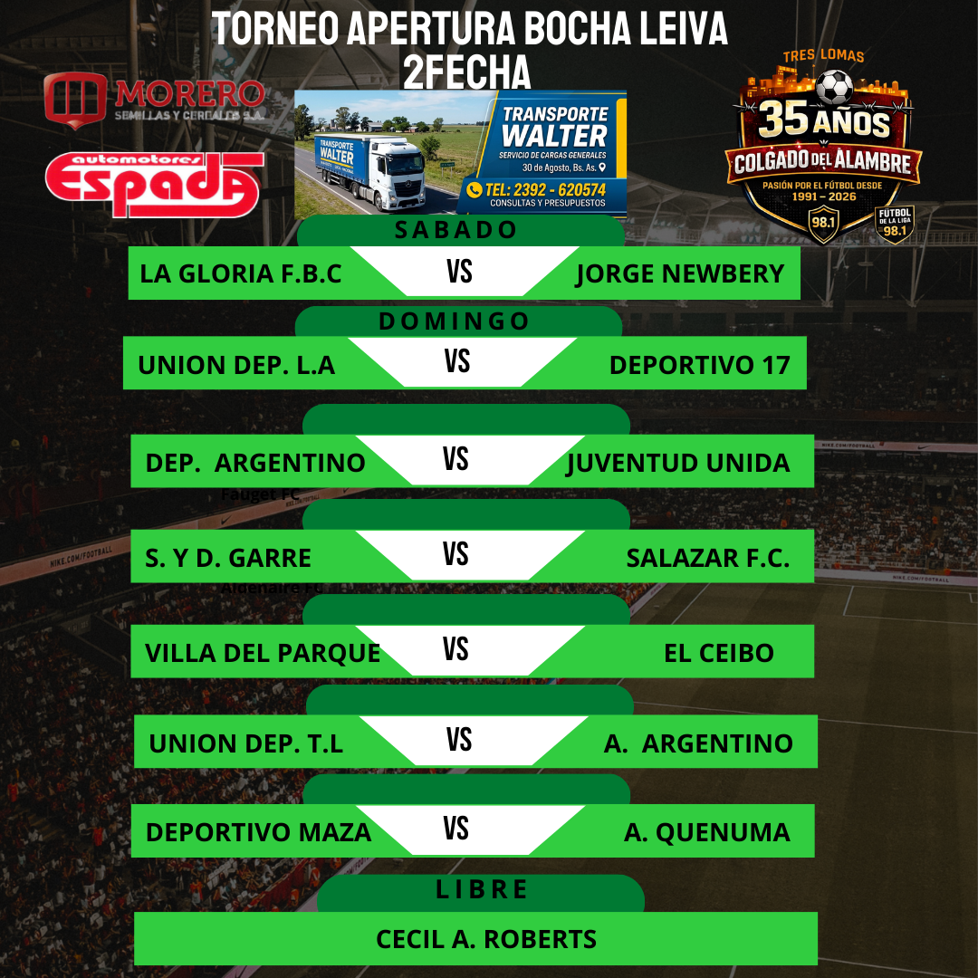 Deportes Fútbol de La Liga: Próxima Fecha Torneo Apertura BOCHA LEIVA 2.ª Fecha 15 de marzo de 2026 admin