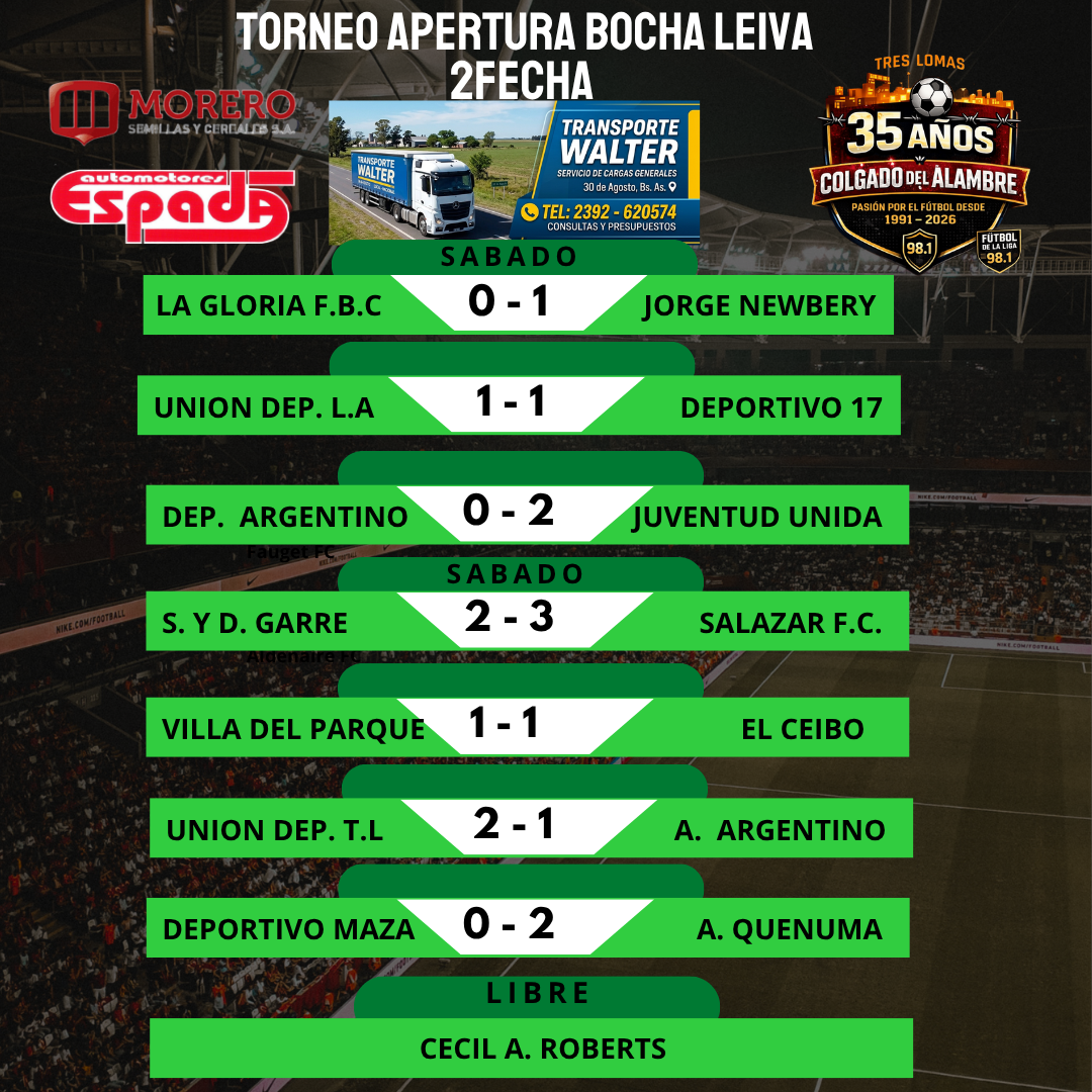 Fútbol de La Liga: Torneo Apertura BOCHA LEIVA 2.ª Fecha