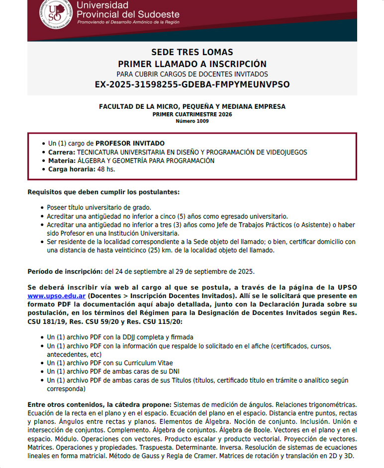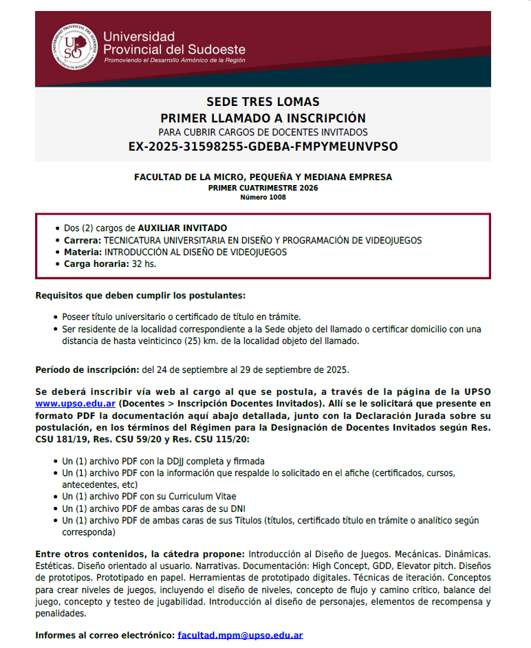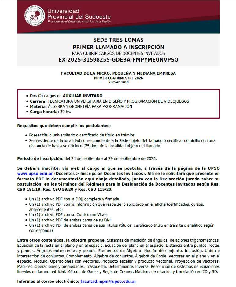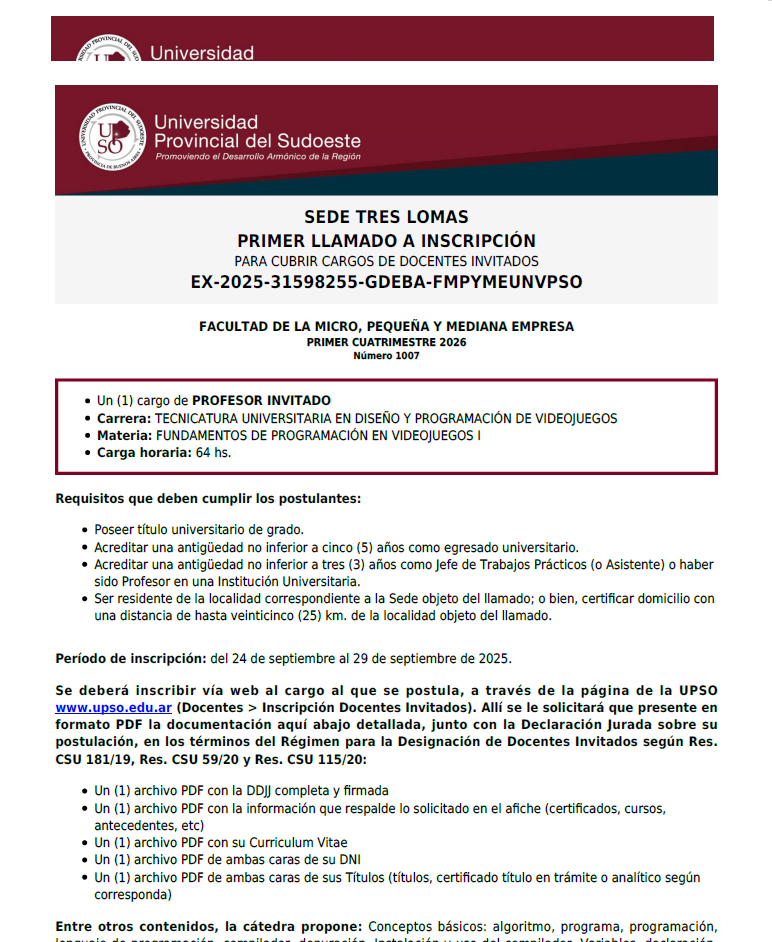La FACULTAD DE LA MICRO, PEQUEÑA Y MEDIANA EMPRESA informa que se encuentra abierta la inscripción para cubrir cargos de docentes invitados, para el dictado de asignaturas durante el primer cuatrimestre del ciclo 2026.