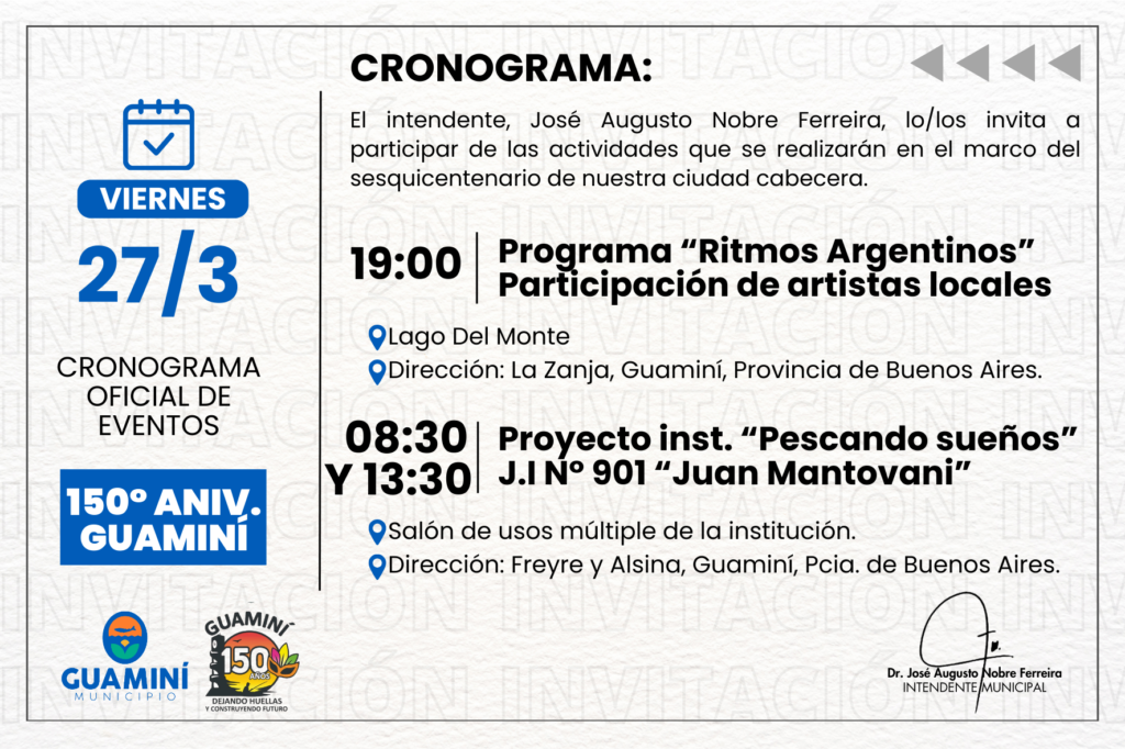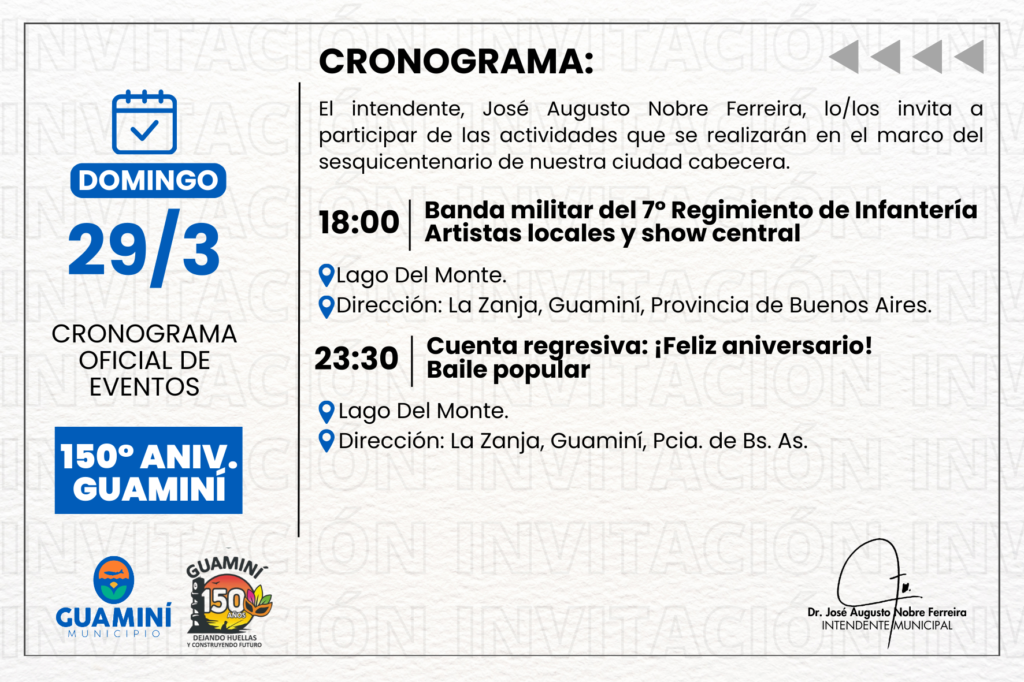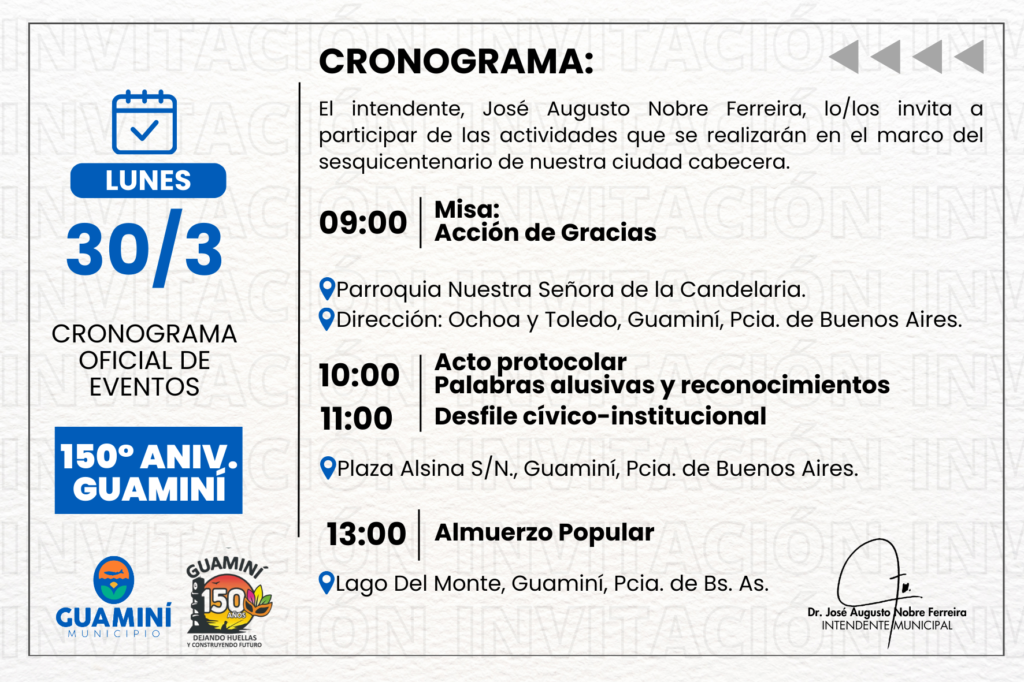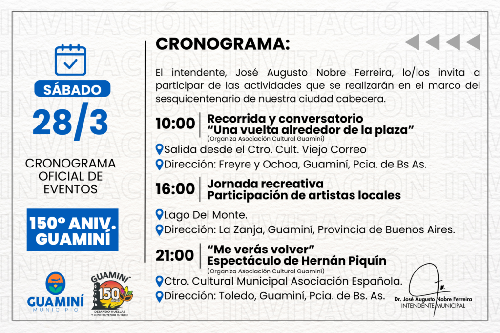 Tenemos el agrado de dirigirnos a ustedes a fin de invitarlos a participar de los festejos por el 150° aniversario de Guaminí, una fecha profundamente significativa para toda nuestra comunidad.