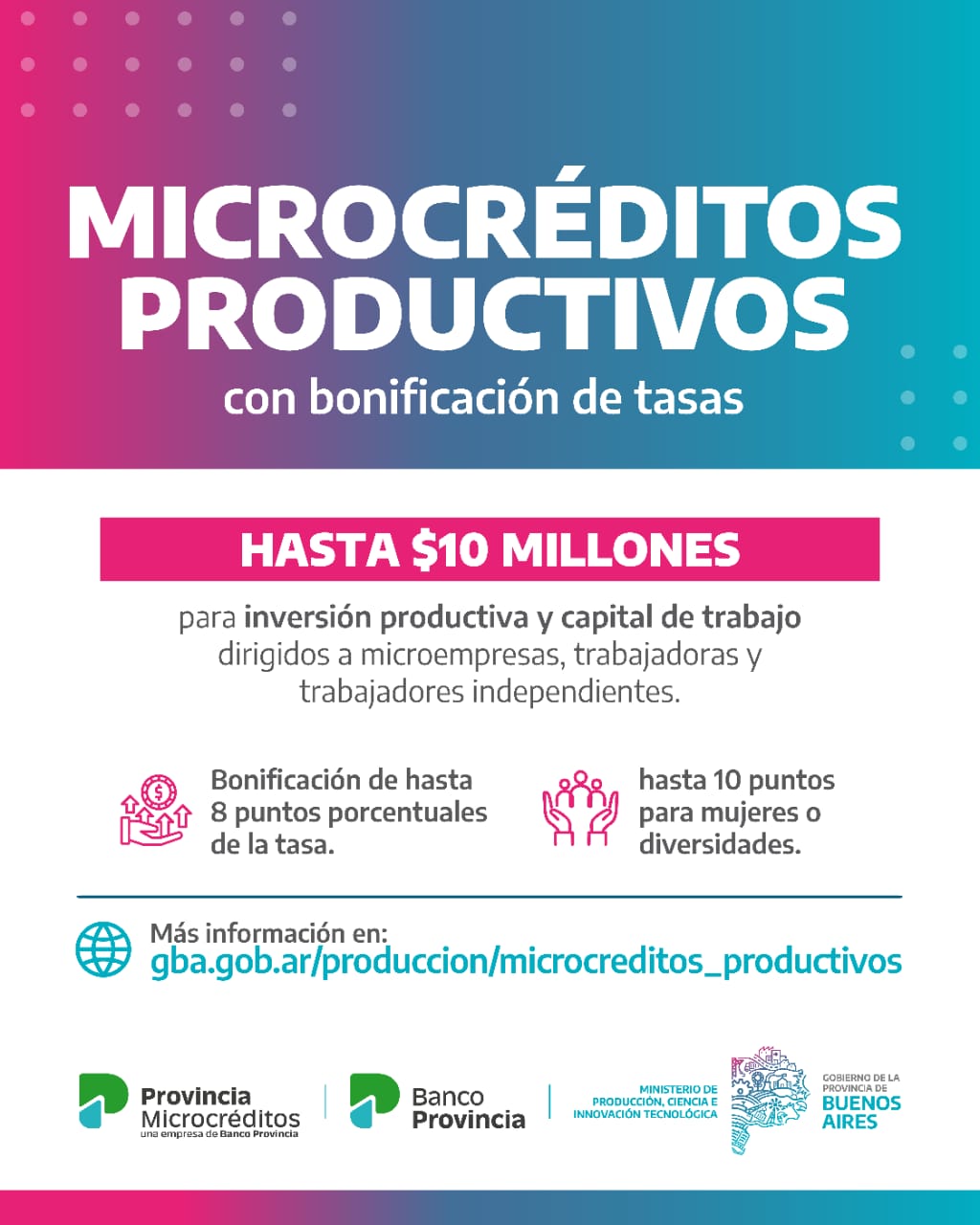 El Municipio de Guaminí informa que se encuentran disponibles los Microcréditos Productivos con Bonificación de Tasas, destinados a trabajadores y trabajadoras independientes con microempresa radicada en la Provincia de Buenos Aires.