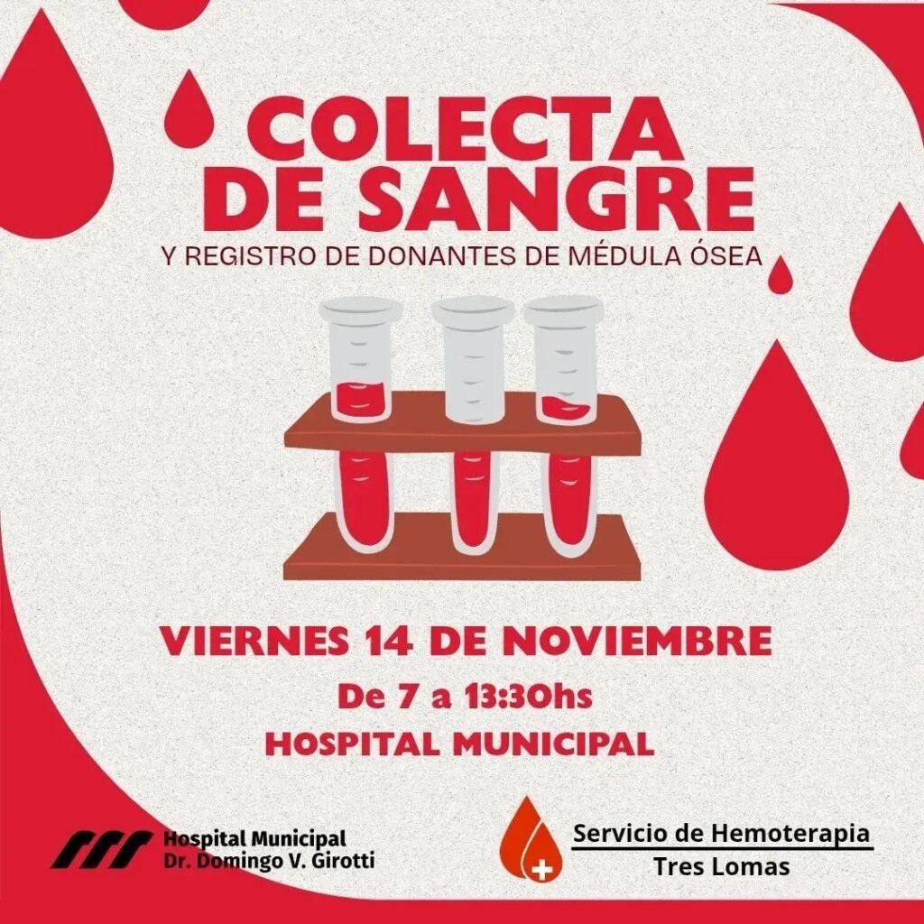 Tres Lomas Nueva colecta de sangre! 28 de octubre de 2025 admin 🗓 Viernes 14 de noviembre ⏰️ de 7 a 13:30hs 📍Hospital Muncipal Te esperamos!! 🩸