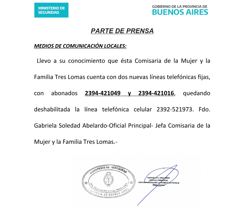 Parte de Prensa Comisaria de la Mujer Tres Lomas