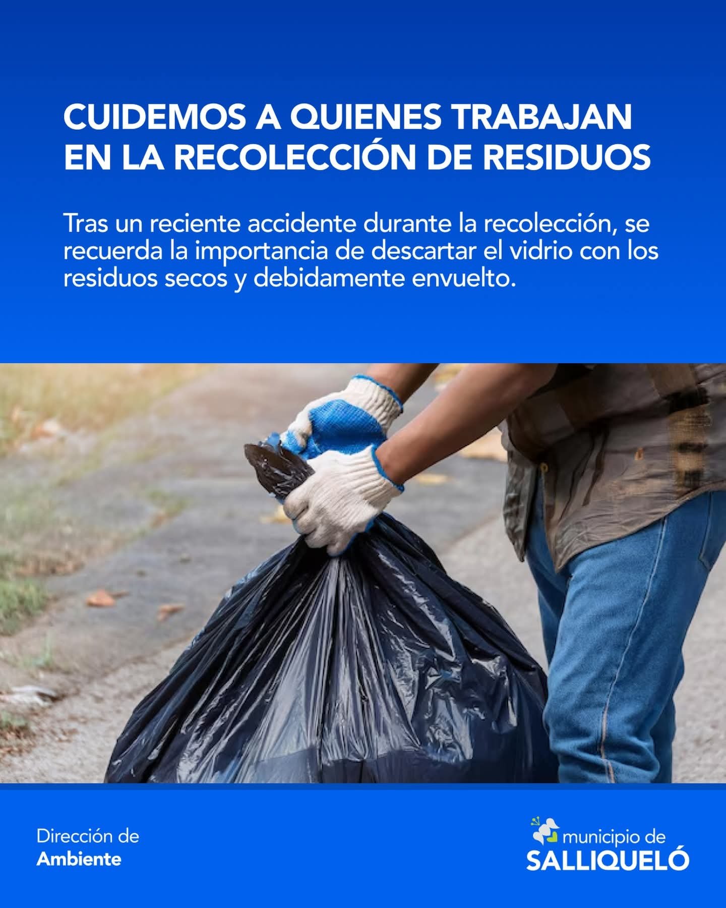Recientemente, uno de los operarios del servicio de recolección sufrió una herida en una de sus manos, cuando un vidrio que se encontraba entre residuos húmedos atravesó el guante de protección. Por este motivo, se solicita la colaboración de los vecinos descartando correctamente para evitar nuevos incidentes.