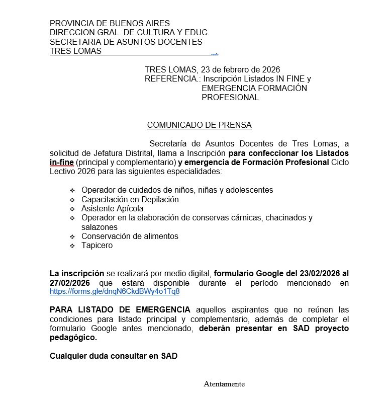 Tres Lomas Sad Tres Lomas: inscripción listados IN FINE Y EMERGENCIA DE FORMACIÓN PROFESIONAL 23 de febrero de 2026 admin
