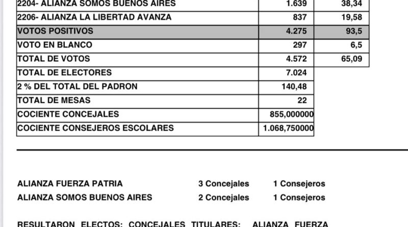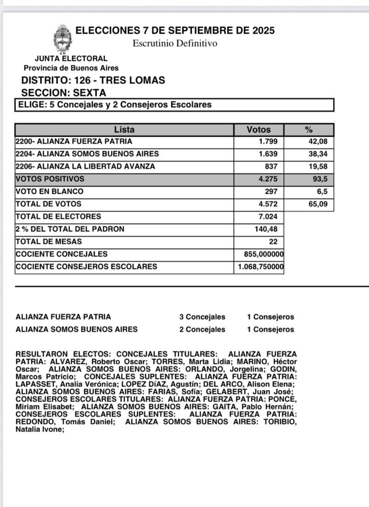 Tres Lomas Tres Lomas: Escrutinio definitivo elecciones 7 de septiembre 26 de septiembre de 2025 admin