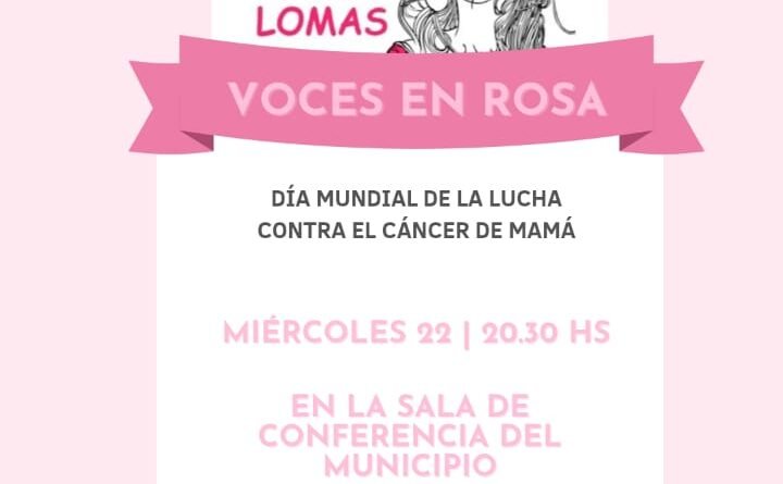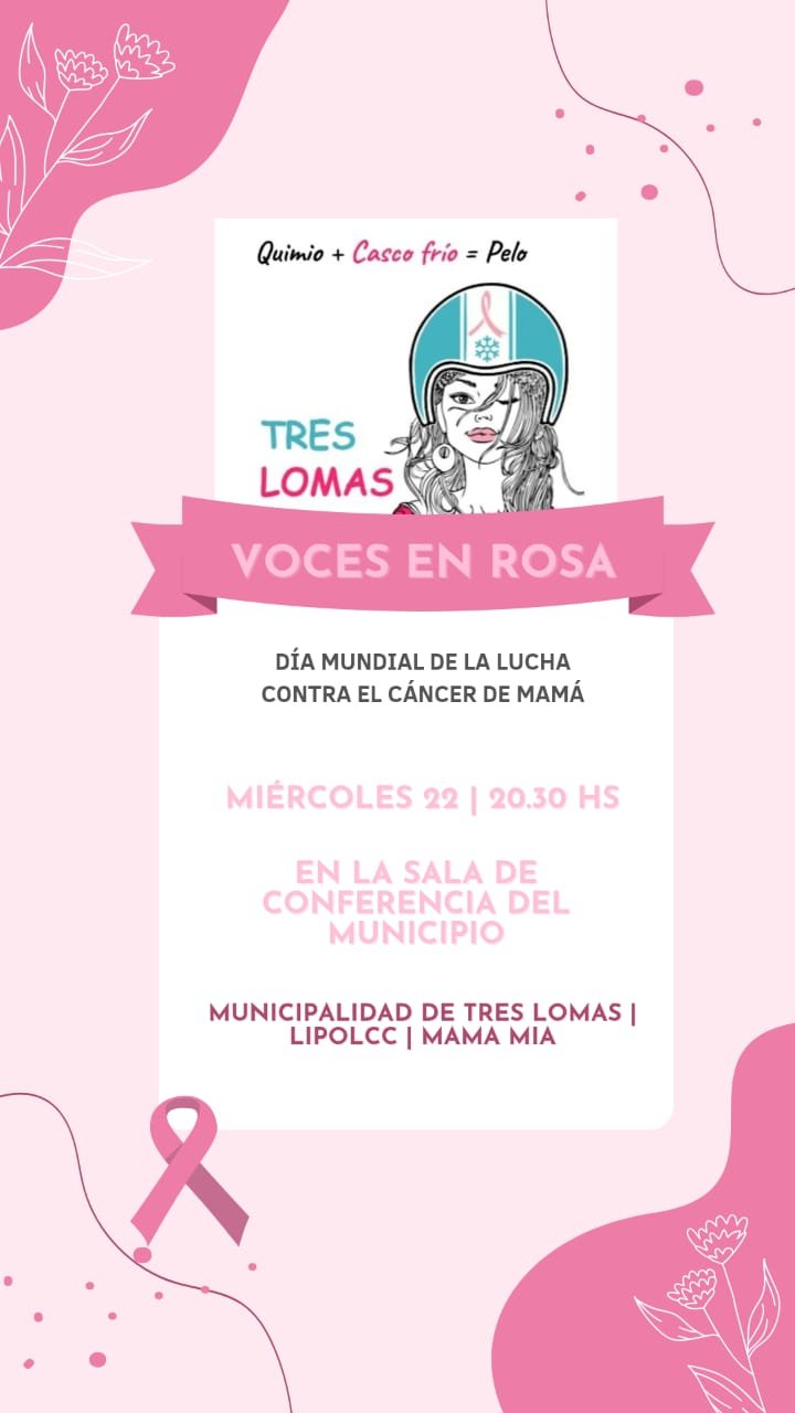 La Municipalidad de Tres Lomas invita a la comunidad a participar de “Voces en Rosa”, una propuesta musical que se desarrollará este miércoles a las 20:30 horas, en la Sala de Conferencias Andrés Pocchiola del Palacio Municipal, en el marco del Mes de la Lucha contra el Cáncer de Mama.